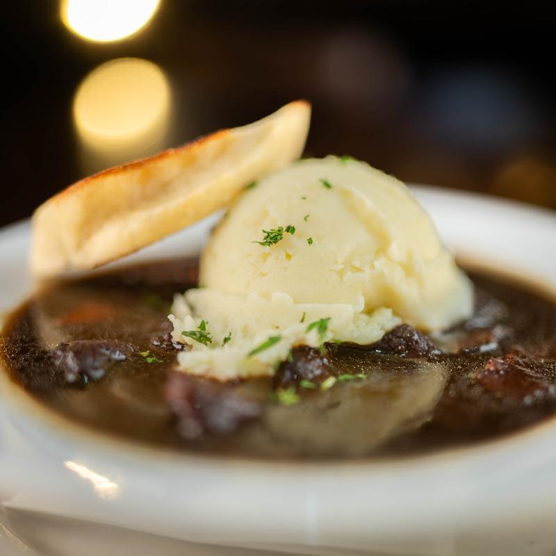 Tender chunks of beef, onion, celery and carrots in a dark brown Guinness gravy with mashed potatoes and crostini.