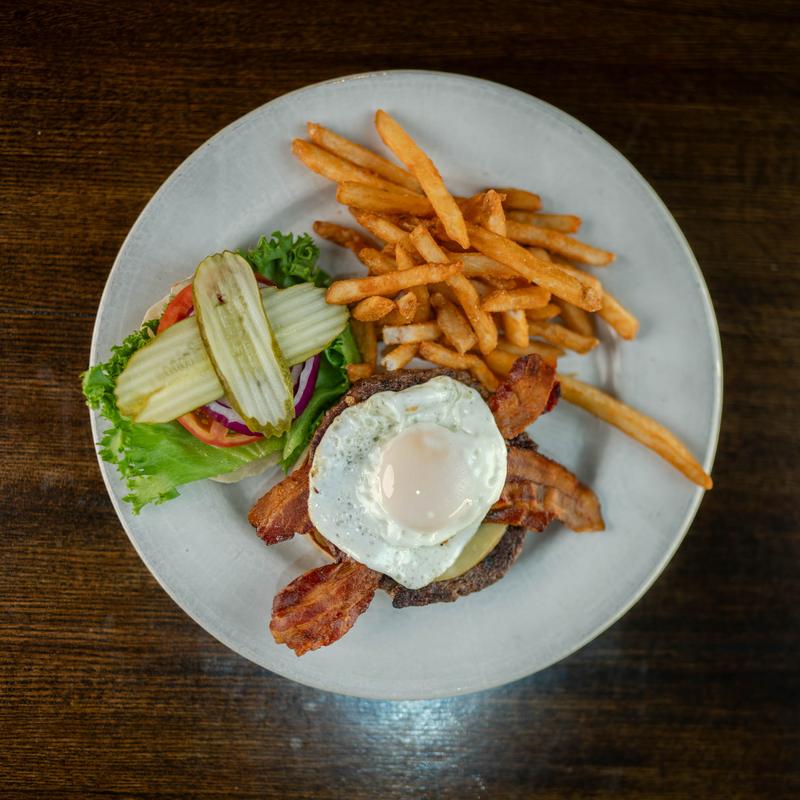 Eight-ounce fresh beef burger, fried egg, smoked gouda, applewood-smoked bacon, lettuce, tomato, red onion, and dill pickle, on a toasted English muffin.