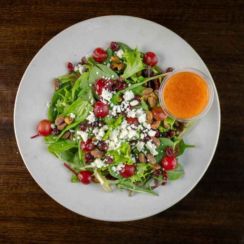 Mixed greens, dried cranberries, pistachios, red grapes, goat cheese, with champagne vinaigrette.