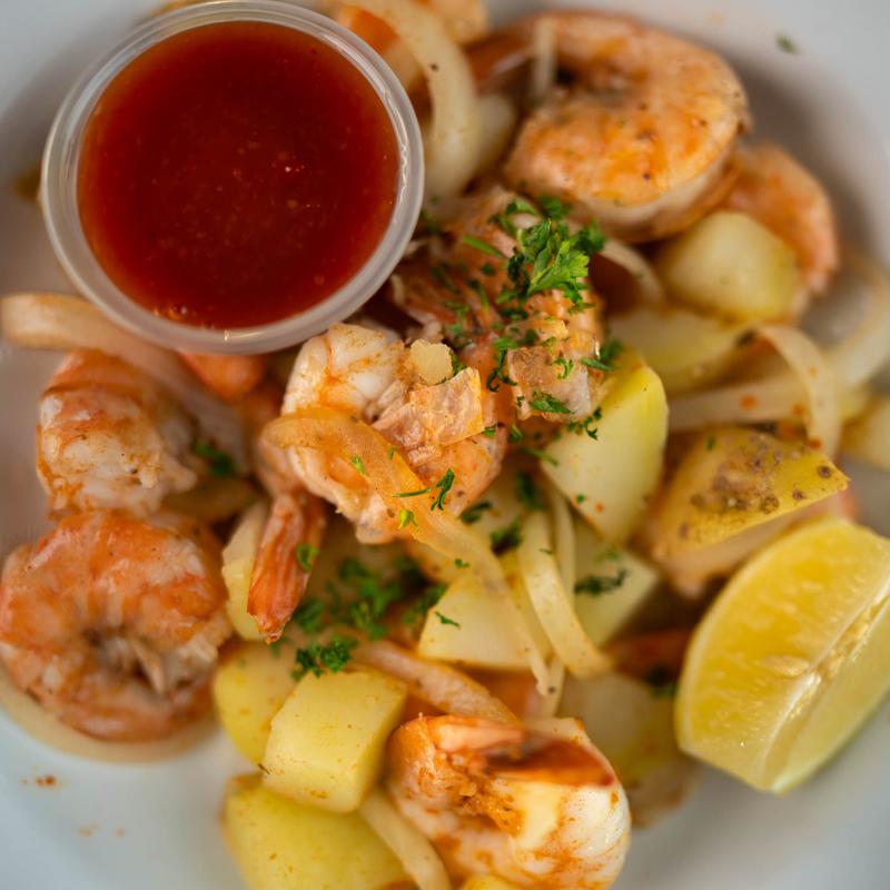 Half pound shrimp, Old Bay, lemon, onions, and red potatoes, served with cocktail sauce.
