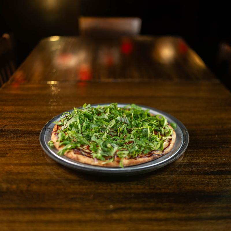 Mozzarella, goat cheese, cherry tomato, applewood-smoked bacon, roasted garlic, red onion, baby arugula, balsamic glaze.