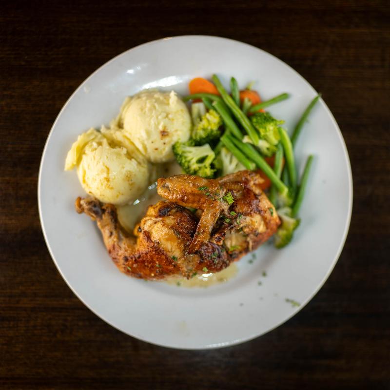 Roasted half chicken with herbs, served with mashed potatoes and the chef's vegetable.