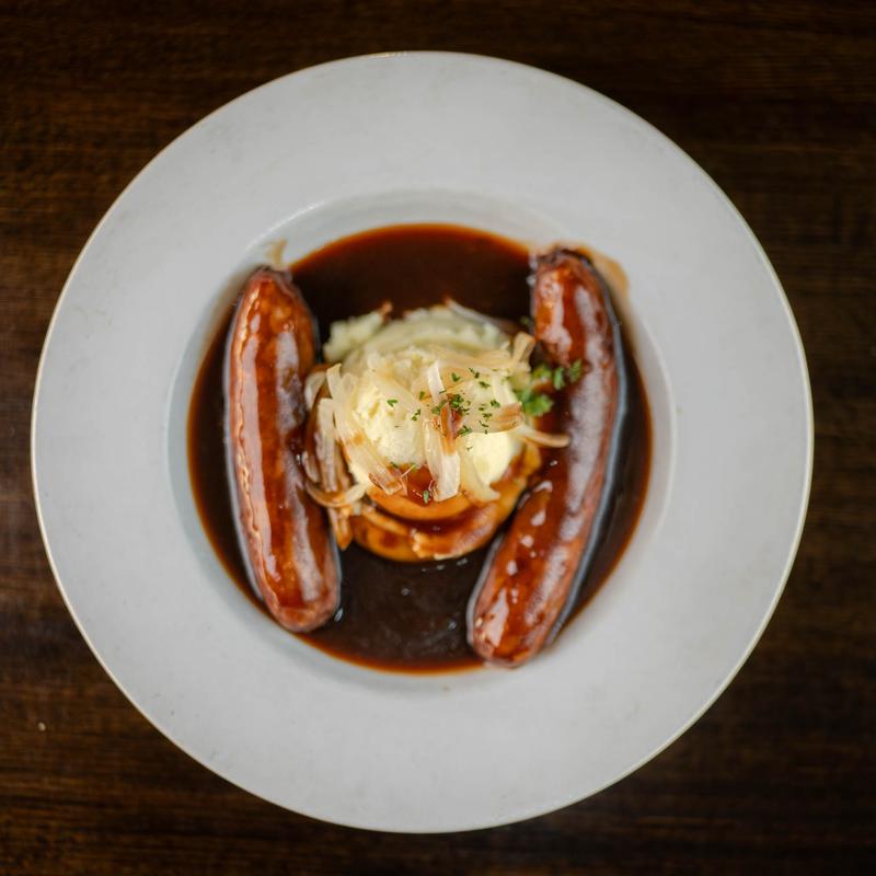 Two English banger sausages, sautéed onions, Yukon gold mashed potatoes, with veal demi-glace.