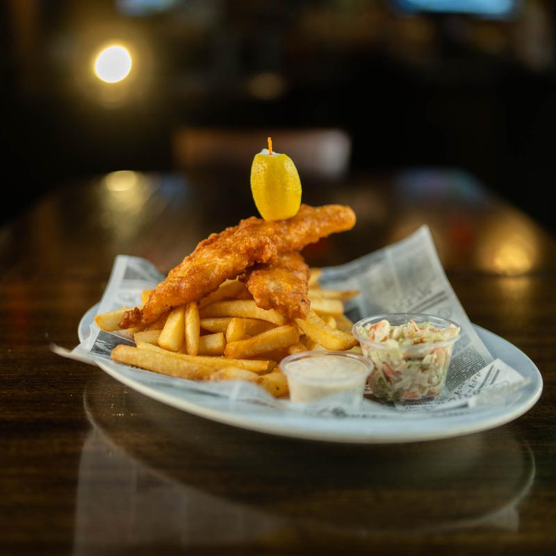 Two ale-battered haddock fillets, thick cut English-style chips, and Fuji apple slaw, served with remoulade | Substitute gluten-free batter +$3.00